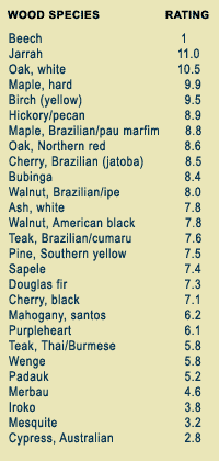 Below is a list of relative hardness for numerous wood species used in flooring. The higher the number the harder the wood. These ratings were determined using the Janka Hardness Test. This should only be used as a general guide when comparing various species of wood flooring. Depending on where the wood is harvested the results may vary + or -. Plank construction and finish are also important factors when determining the durability and ease of maintenance of any wood floor.